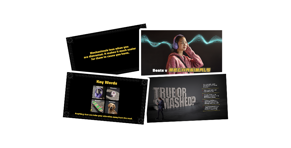 Encourage discussion about pedestrian distractions. Why should you have the sound lower or an ear clear when walking near Mechanimals? Is talking on your phone as dangerous as listening to music? How many accidents are caused by distractions?